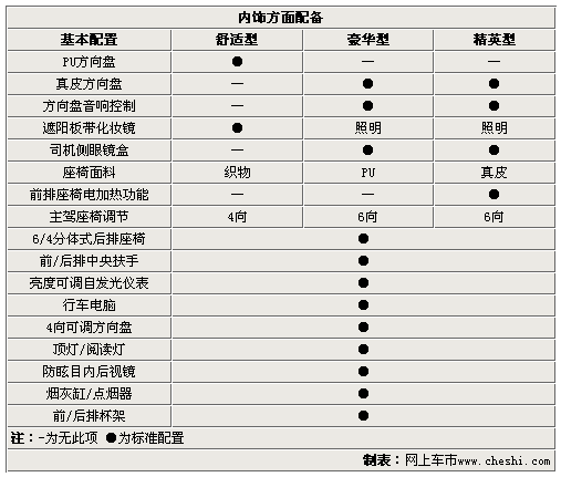在基础功能上,车内采用了上黑下浅的双配色配色设计风格,此外银色装饰起到了点缀作用,车内的视觉效果明显提升,另外,信息展现更全面的双层仪表盘设计在同级车型中很少出现。非常实用的6/4分体式后排座椅、前/后中央扶手、亮度可调自发光仪表、行车电脑前后杯托架都成了标配,另外,集成了音响控制的真皮方向盘、带照明及遮阳功能的化妆镜、司机侧眼镜盒及主驾驶6向调节等等都成为豪华型和精英型的共享配置,而更高一级的真皮座椅则成了精英型的独享配置。