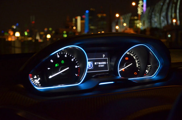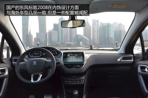 东风标致2008在内饰设计方面简洁、时尚、运动。但是在配置方面与国外车型相比有一定的简配,如“多路况适应系统”更加高级的JBL音响系统、车顶LED光带等均被简配,不过拉风的内饰LED氛围灯得以保留,保持了标致浪漫时尚的风格,梦幻的蓝色光晕让中控台处处体现浪漫风格,仪表中央三个按钮可以控制氛围灯。