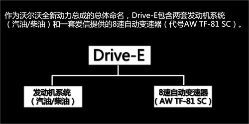 作为沃尔沃全新动力总成的总体命名,Drive-E包含两套发动机系统(汽油/柴油)和一套爱信提供的8速自动变速器(代号AW TF-81 SC),采用VEA(Volvo Engine Architecture)架构,所有发动机架构均被限制为2.0排量直列四缸结构,采用模块化设计理念,即汽油/柴油发动机本体设计完全一致,具备相同的缸间距, 缸径及冲程,通过匹配不同增压单元,实现动力上的差异化。