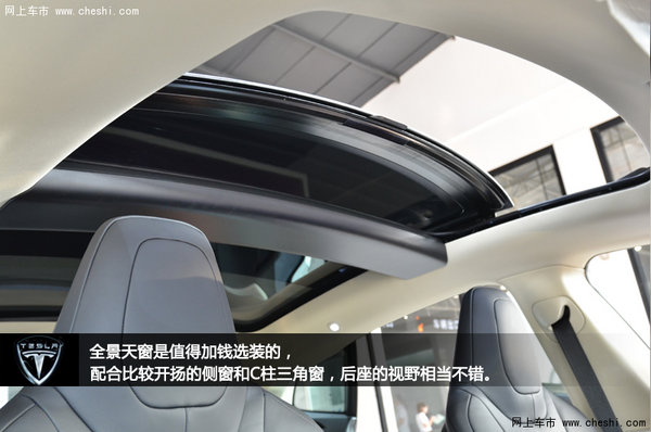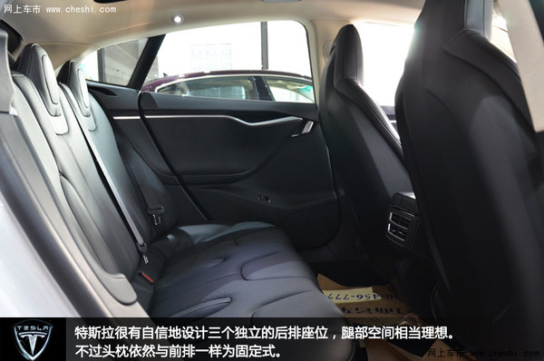 后排座椅的腿部空间相当理想,而且基于全平底盘设计,提供了完全平台的地台,加上整车宽度优势,特斯拉很有自信地设计了三个独立的一体式座位。不过头枕依然与前排一样为固定式,而且基于轿跑车造型,后座的头部空间比较紧张,身高175cm的乘客已经有顶头现象。不过后排空调出风口的设计值得夸奖,弧形的设计为中间乘客提供了不小的脚部空间。