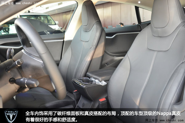 特斯拉Model S的车厢设计风格和外形的理念是一致的——追求不落俗的同时,不要过于前卫,要让人比较容易接受。Model S的仪表台设计是相当简洁。车子没有通电按钮,打开车门或驾驶座上坐人时,就会自动通电。车厢做工用料达到豪华车水准,所有能铺真皮的地方都铺上了,尤其是门壁板的大面积弧形皮面,不仅豪华,也有科技感。车顶浅色Alcantara材质是全系标配,足够显档次。