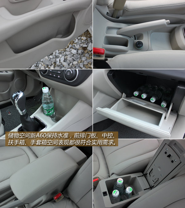 储物空间部分新A60保持水准,前排门板、中控、扶手箱、手套箱的空间表现都很符合实用需求;后排方面表现不佳,门板依旧没有加入储物空间,中央可折叠扶手顶端的双杯架深度实在太浅,即便有稳定设计,依旧无济于事。好在前排座椅背后有储物袋,解决了一些问题,中期改款显然有些实际问题还是没有得到解决。