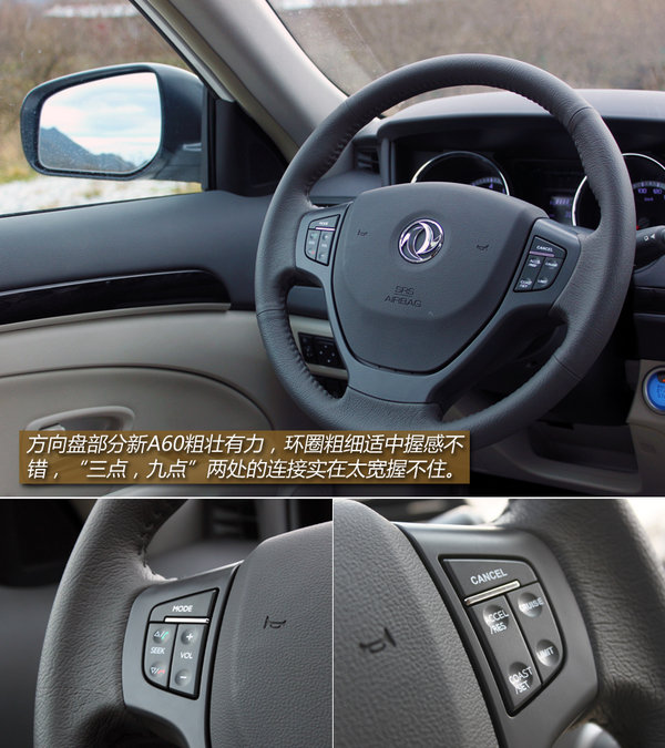 仪表部分沿用了老款双炮筒的设计,中央黑白屏幕行车电脑功能齐备、显示清晰,不过若是换成彩屏则更显品质。方向盘部分新A60依旧十分粗壮有力,环圈的粗细适中握感不错,两侧功能按键的设计合理性跟反馈力道都有合资水准,不过可惜的是,“三点,九点”两处的连接实在太宽,握不住的状态多少让人觉得不太适应。