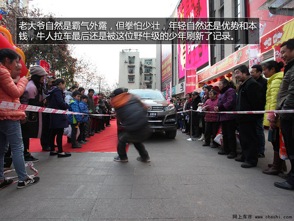 第一环节的老大爷真可谓是老当益壮,面对车重2吨的驭胜S350他毫不畏惧,只身一人便将其拉到了终点处。不过在这里还是要说一句拳怕少壮,最后的赢家仍然是被这位正当年的小伙儿给拔得头筹了。